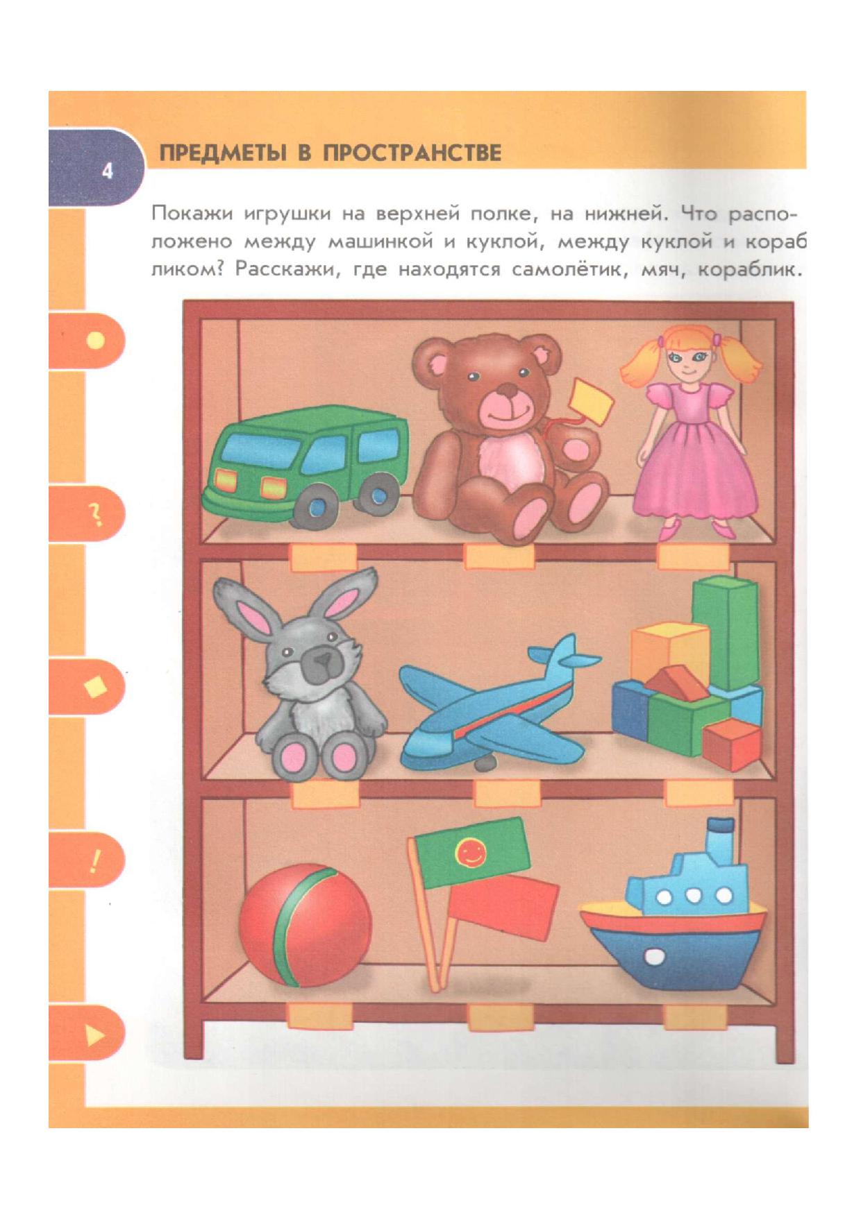 Цель: учить определять пространственное размещение предметов относительно данного предмета, относительно другого предмета; учить владеть понятиями слева, справа, над, рядом, под, внутри; развивать воображение, первичное умение доказательно размышлять, графические навыки, эмоционально-волевую среду; воспитывать любовь к математике, усидчивость, настойчивость в выполнении заданий.
