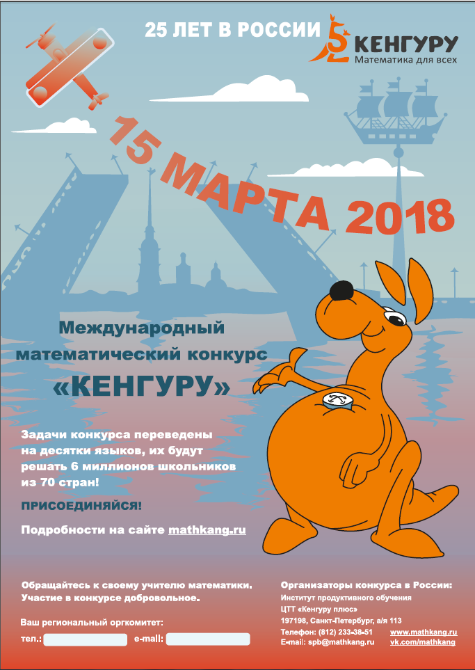 Математический кенгуру — это международное соревнование по математике для детей 1–12 классов , которое проводится ежегодно в третий четверг марта. Победители могут размещаться на сайте, выигрывать медали, подарки и даже академические стипендии! Каждый ребенок получает футболку, сертификат об участии и подарок в день тестирования. Какой отличный способ привить любовь к математике у всех детей.