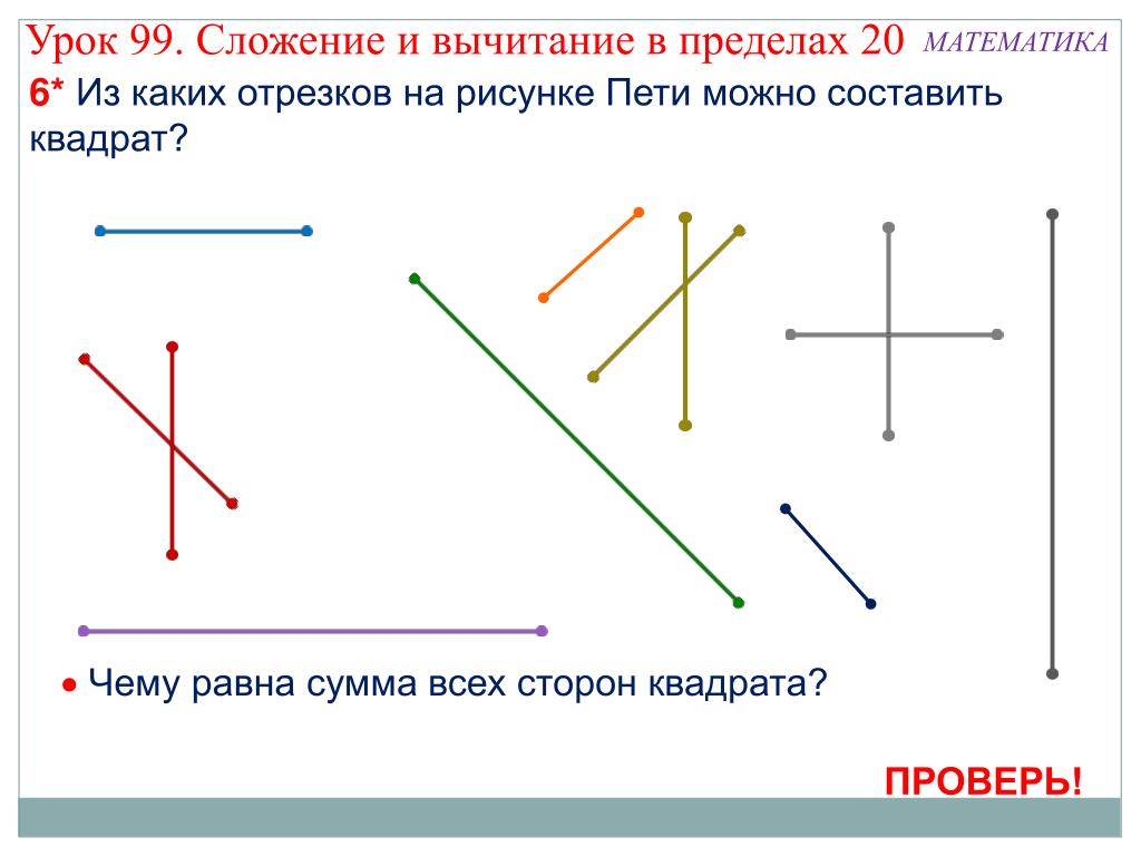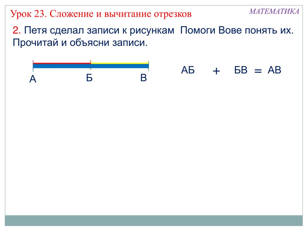 – Из чего состоит длина большого отрезка ( Из длин двух маленьких отрезков)