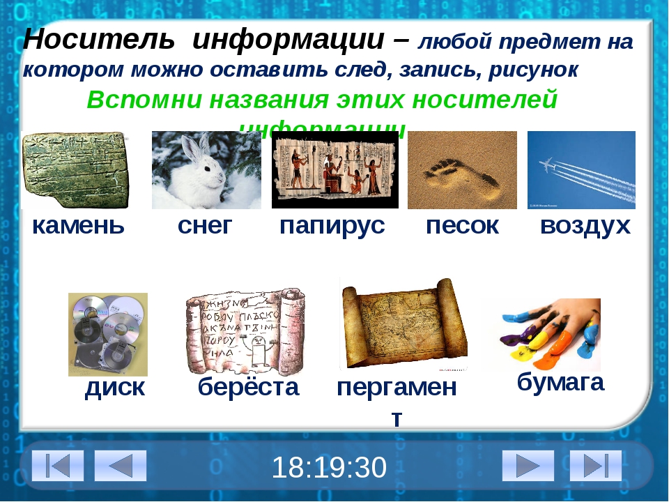 дать учащимся представление о древних и современных носителях информации, показать разнообразие носителей информации, научить распознавать и называть разные виды носителей информации.