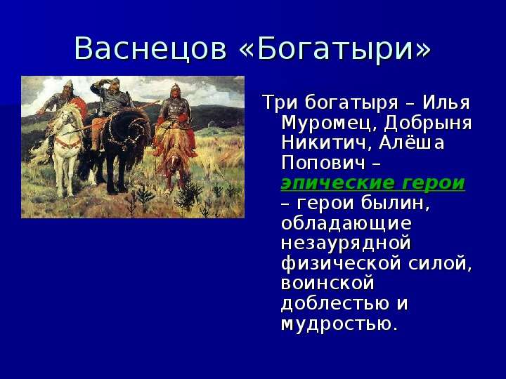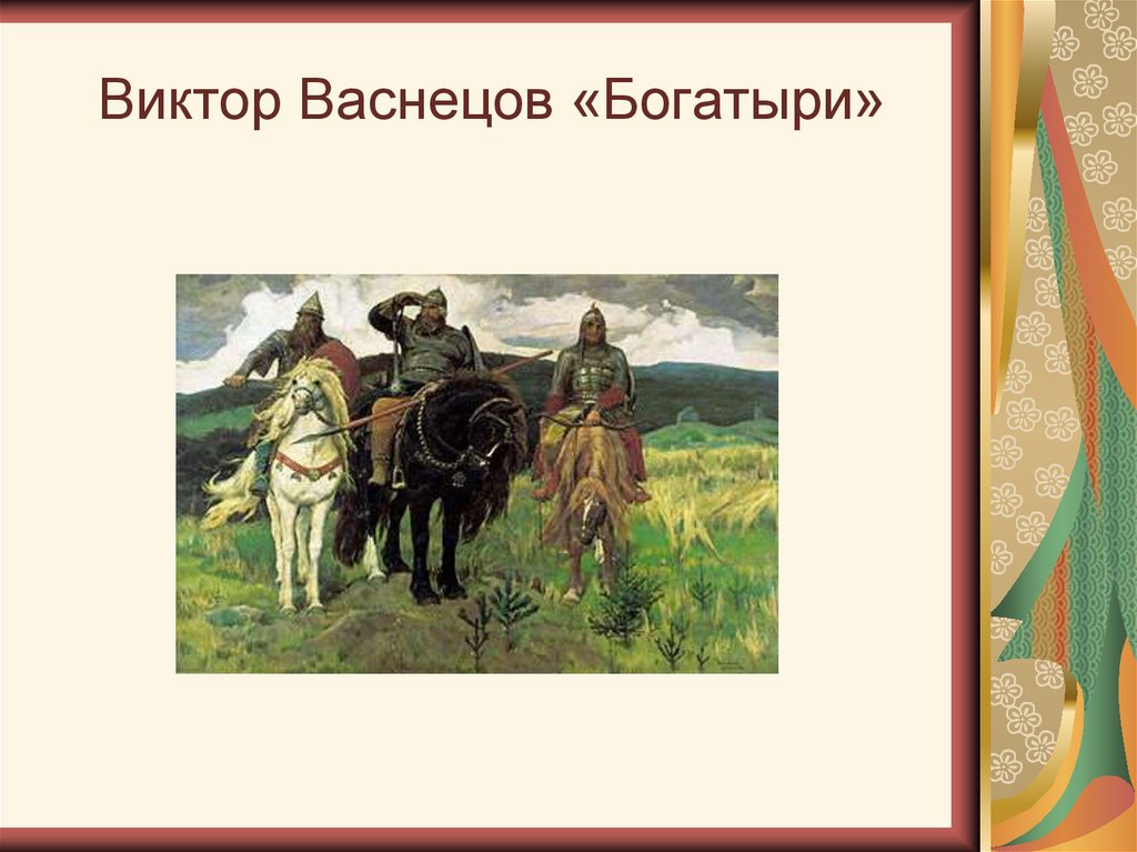 Ребята, подвиги русских героев – богатырей отражены не только в былинах, но и в творчестве художников.