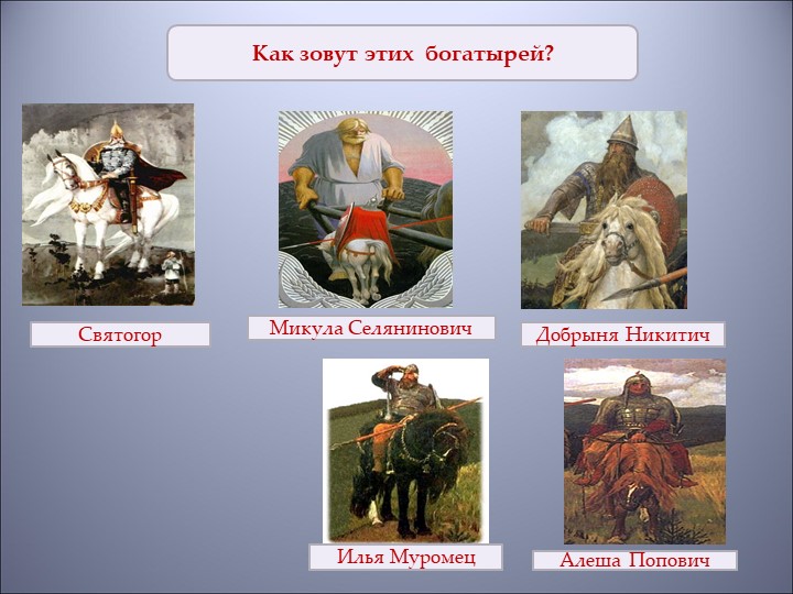 Илья Муромец, Добрыня Никитич, Алёша Попович, Вольга Святославович, Микула Селянинович.