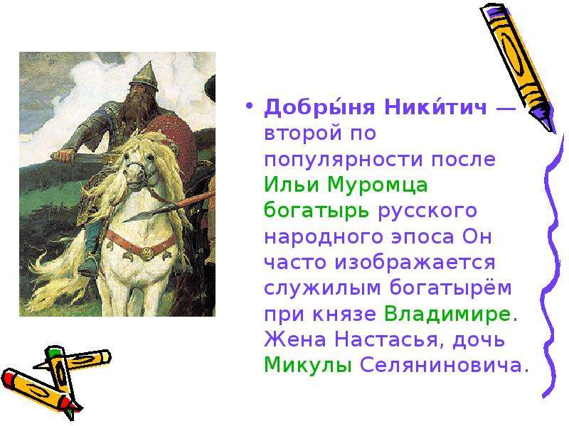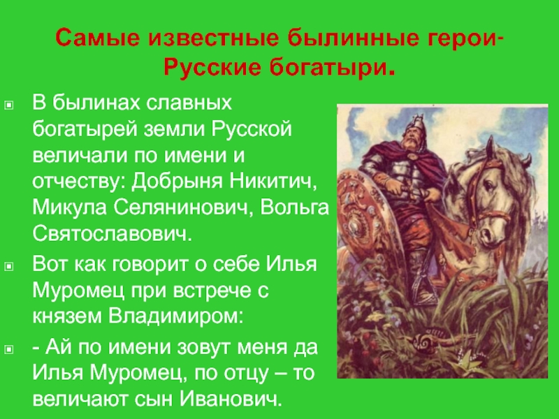 Кто слева от Ильи Муромца? (Добрыня Никитич). Расскажите о нём, какой он?