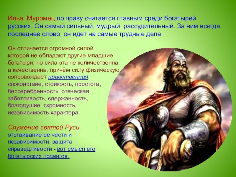 Как вы догадались, что это Илья Муромец? (Он самый старший, могучий, мудрый и опытный богатырь).