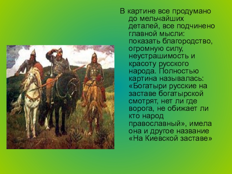 Великий русский художник Виктор Михайлович Васнецов изобразил картину «Богатыри». Давайте её рассмотрим и побеседуем о ней.