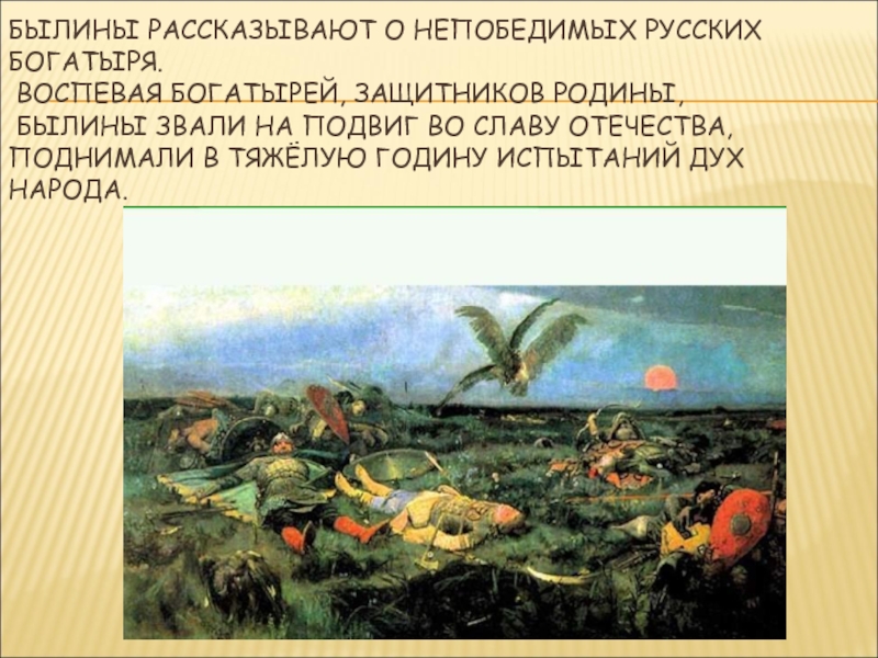 Вот так слагалась былина. В русском народе много столетий из уст в уста, от деда к внуку переходили былины о могучих богатырях. В былинах отражалась жизнь русского народа, которая была очень нелёгкой на Руси. Богатыри очень много работали оттого и были они могучими и сильными. И каждый раз они вставали на защиту своей земли. Герои – богатыри сделали целью своей жизни служение своей Родине – Руси.Много песен и былин сказывал народ о их силе и подвигах, мужестве и отваге.