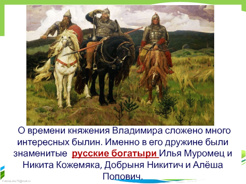 Наше занятие о русских богатырях подходит к концу, а мы вспомним о том, какой завет оставили богатыри нам, своим потомкам: