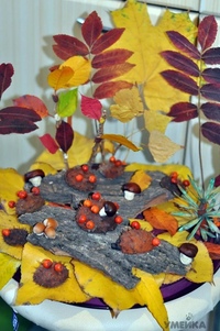 Затем основу преображаем в лесные краски из природного материала, а именно листьями, веточками, шляпками желудя, маленькими шишками.