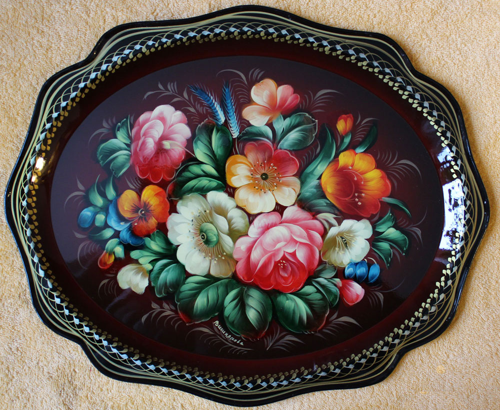 Но самый распространенный вид жостовской росписи подносов – это букет, расположенный в центре подноса и обрамленный на доске мелким золотым узором.