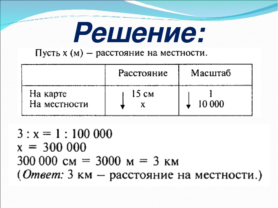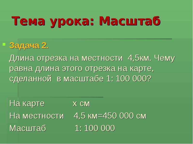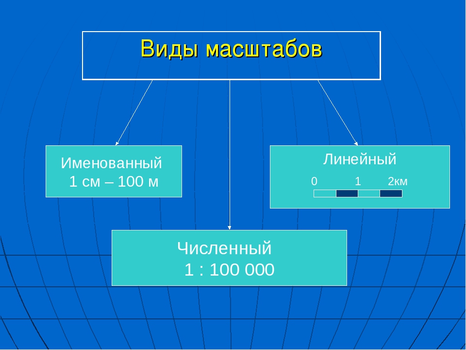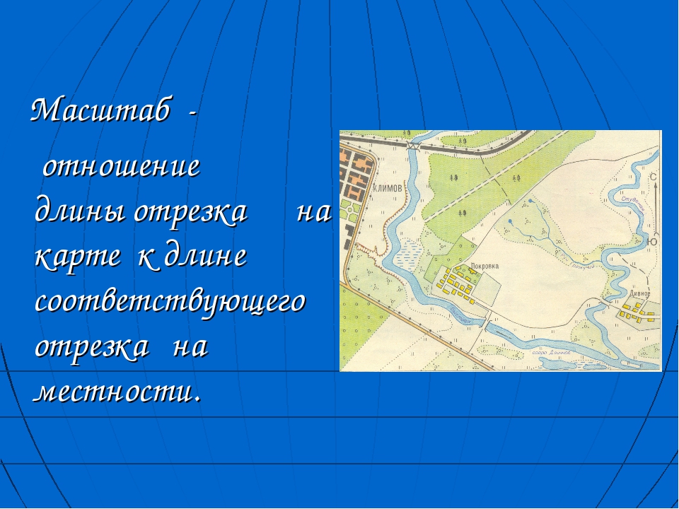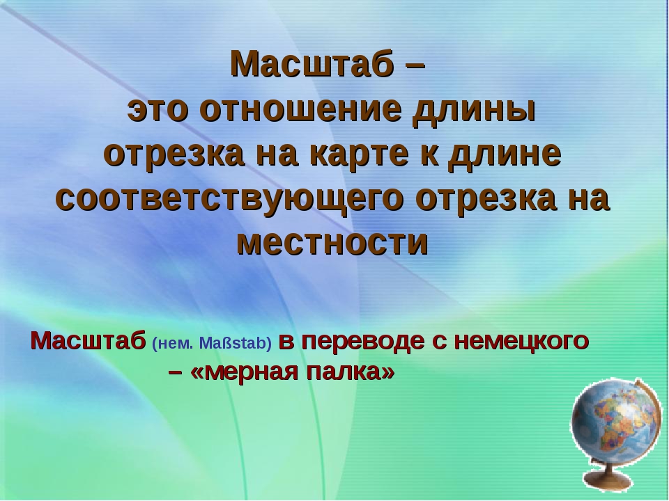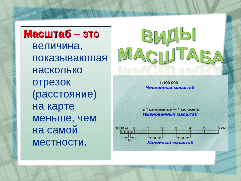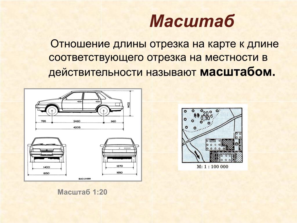 Масштаб – это отношение длины отрезка на карте к длине соответствующего отрезка на местности.