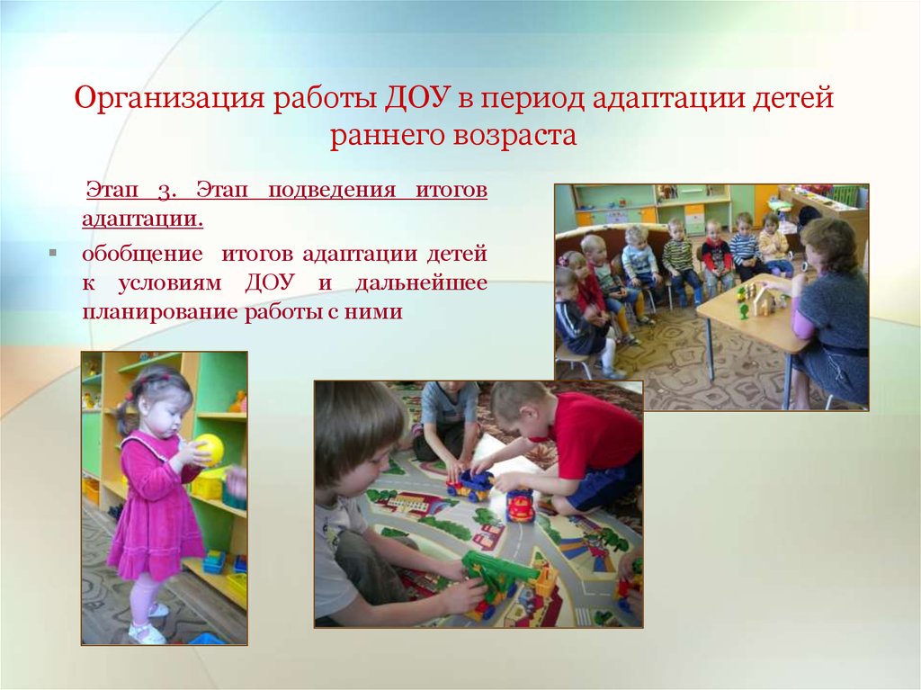 В процессе длительных наблюдений за адаптационным периодом детей раннего дошкольного возраста к условиям детского сада выявлено, что при переходе ребенка из семьи в дошкольное учреждение необходима разработка таких механизмов, обобщение опыта и единых этапов, чтобы привыкание малыша к детскому саду было максимально безболезненным.