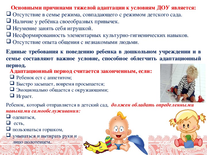 Приспособление организма к новым условиям социального существования, новому режиму сопровождается изменением поведенческих реакций ребенка, расстройством сна, аппетита. Наиболее сложная перестройка организма происходит в начальной фазе адаптации, которая может затянуться и перейти в дезадаптацию, что может привести к нарушениям здоровья, поведения и психики ребенка.