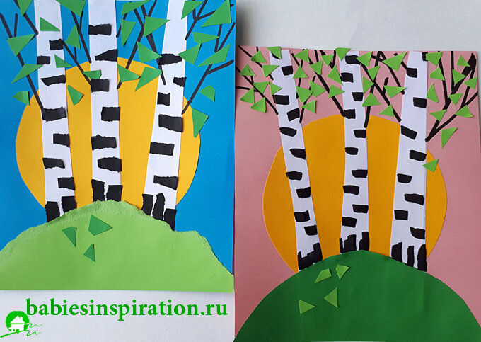 Аппликацию березы можно сделать разными способами. Например, из бумаги наклеить белый ствол, зеленую траву, а листья нарисовать с помощью губки. Или вырезать и приклеить симметричную березку по принципу снежинки. Предлагаем несколько мастер-классов.