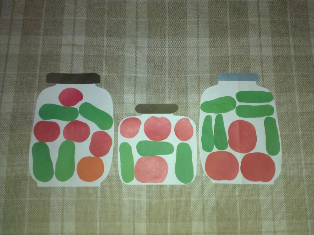 Воспитатель: Вот в этих банках мы будем консервировать наши овощи. Вам нужно будет вырезать их и наклеить в банку