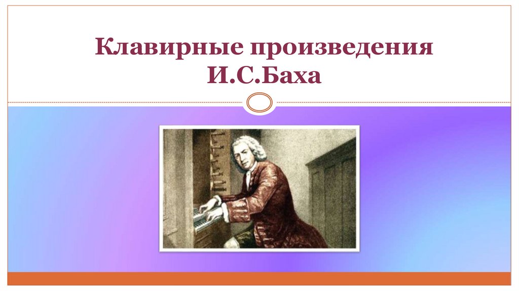 – В кн:. Майкапар С.М. Музыкальное исполнительство и педагогика. – Челябинск: MPI, 2006. C. 115. И.С.Бах. Его клавирное творчество. И.С.Бах – исполнитель и педагог. Один из периодов музыкального искусства связывают с деятельностью гениального немецкого композитора. Иоганн Себастьян Бах – /1685-1750/ самый выдающийся представитель семейства Бахов. В ХУП – ХУШ столетиях музыкальное искусство в Германии достигло значительного развития. В своем творчестве Бах отразил умонастроения страдания и веру в лучшее будущее немецкого народа. Образы баховского творчества охватывают поразительно широкую идейно – эмоциональную сферу: передача глубоких человеческих чувств – радости, торжества, драматизма- от скорбных монологов до традиционного высочайшего пафоса. Вместе с тем музыка Баха отличается простотой и искренностью. И.С.Бах – НОВАТОР 1) довел до высшей точки язык полифонии и такие важнейшие формы, как фуга и сюита.