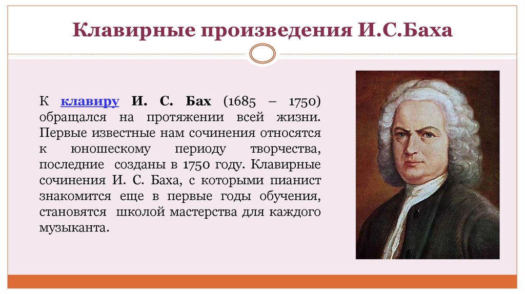 Большинство клавирных произведений Баха были созданы им в зрелом возрасте и обязаны своим появлением его глубокому интересу к музыкальному образованию. Клавирные произведения И. С. Баха включают: сюиты, инвенции, концерты, 2 тома ВТК, «Вариации Гольдберга», «Музыкальное приношение» (11 пьес для клавира и сонаты для трех разных инструментов), «Каприччио на отъезд любимого брата.«Искусство фуги» (14 фуг и 4 канона на одну тему, хроматическая фантазия и фуга) и др. Пьесы эти писались в основном для обучения собственных сыновей и других одаренных учеников.
