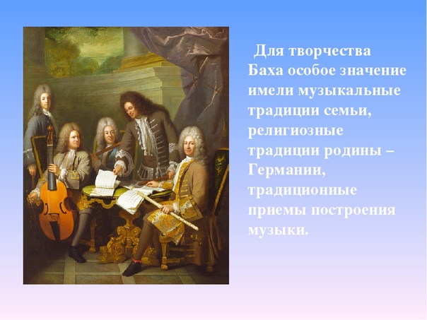 Дж.С.Бах – немецкий композитор, величайший гений в истории музыки, живший и творивший в эпоху барокко. Музыкальное наследие Баха вошло в золотой фонд мировой культуры, а его бессмертные шедевры вне времени. Музыка Баха — это история человечества, выраженная в звуках. Его талант был многогранен – композитор, непревзойденный мастер полифонии, органист, клавесинист, скрипач, педагог. Творчество Баха принадлежит к интеллектуальной музыке, одним словом – это вечное и прекрасное искусство!
