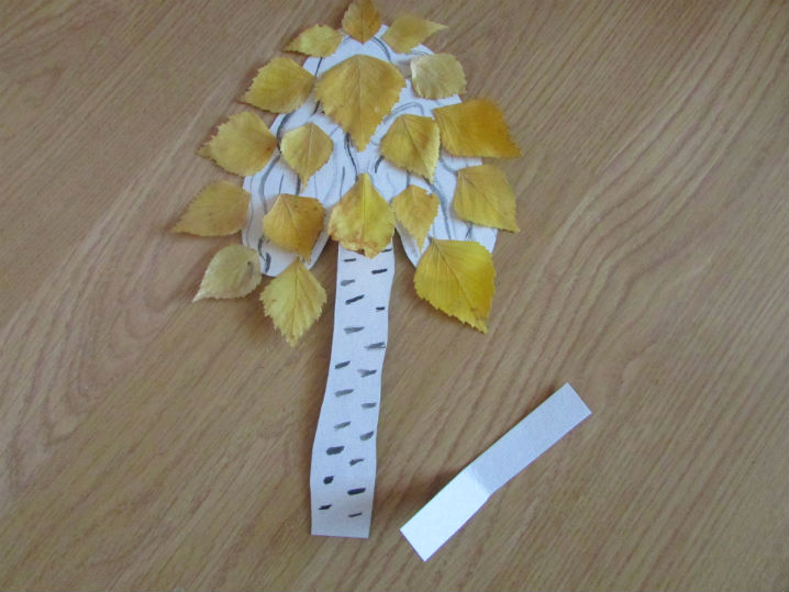 Разворачиваем края фрагмента, смазываем клеем, и приклеиваем внутри. Таким образом оформляем все фрагменты ствола. Эта березка отлично подойдет как вариант поделки для детского сада. Справится даже пятилетний малыш, естественно, под чутким руководством взрослого.