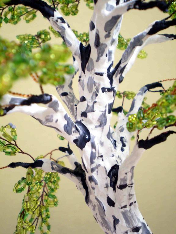 5. Когда все высохнет, фольгу с веточек снимаем и расправляем их, придавая березе из бисера естественность.