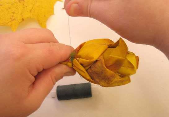 Получившиеся цветы из листьев деревьев необходимо надежно зафиксировать клеем и нитью. Можно вначале промазывать каждый листик клеем и сворачивать его в трубочку или, наоборот, уже готовую заготовку проклеить и зафиксировать на период высыхания нитью, не забыв ее снять по окончании процесса приготовления.