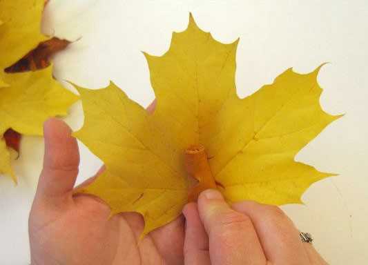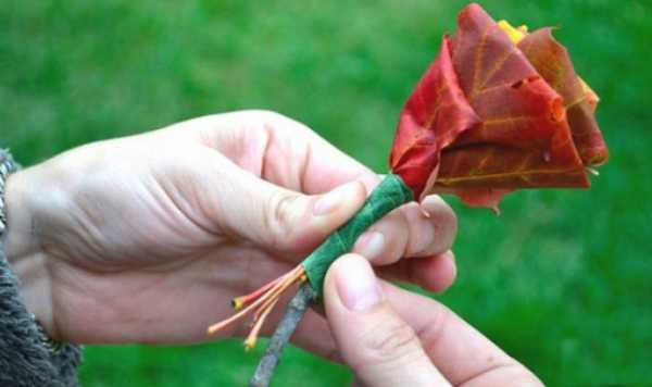 После сворачивания этого листа у вас должна получиться вот такая красивая розочка. Если вам покажется, что «лепестков» недостаточно, то можно обернуть бутон другими кленовыми листьями по той же схеме, что описана выше.