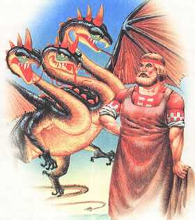 Вдруг из неведомых краёв налетел на Киев Змей Горыныч. Сам зелёный, глаза красные, крылья железные, когти медные, на змеиных шеях – десять голов, десять хоботов.