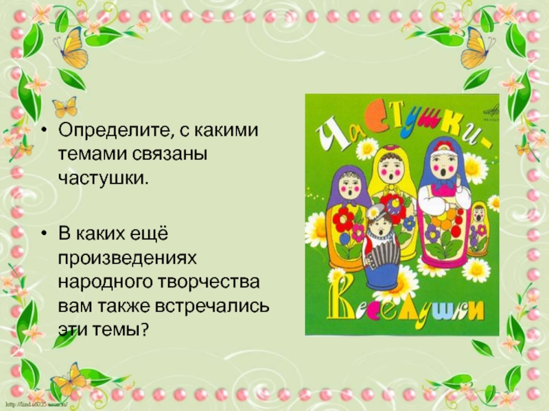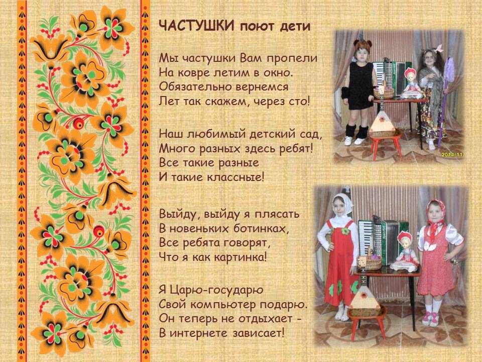 5. Не меньшую роль в воспитательно-образовательном процессе детского сада могут сыграть народные песни, потешки, частушки, которые развлекают ребенка, создают у него доброе и радостное настроение.