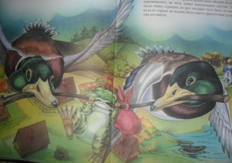 Утки красочно рассказывали о тёплых странах, где всегда светило солнышко и было много корма. Лягушка представила себе это чудесное место, и ей так сильно захотелось побывать на юге, что она решила отыскать какой-то способ сделать это. Лягушка была очень сообразительной и попросила уток перенести её на юг при помощи прутика. Добрые утки согласились на это необычное предложение. Лягушка схватилась за прутик, и утки, взяв его в клювы с обеих сторон, взмыли ввысь.