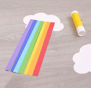 Нарисуйте на белой или голубой бумаге контур тучки и вырежьте его. Из сложенных пополам листов цветной бумаги вырежьте половинки капель по сгибу. Приложите к правой половине одной заготовки левую половину другой детали и склейте их между собой.