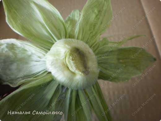 5. Стебель можно обкрутить потом флористической лентой зеленого цвета. Это будет традиционно и привычно. но я бы не сказала, что превосходно. Мне больше понравилось отступить от правил и сделать стебель цветка не зеленым из бумаги, а обкрутить его также листом кукурузы с использованием клея ПВА. (см . последнее фото).