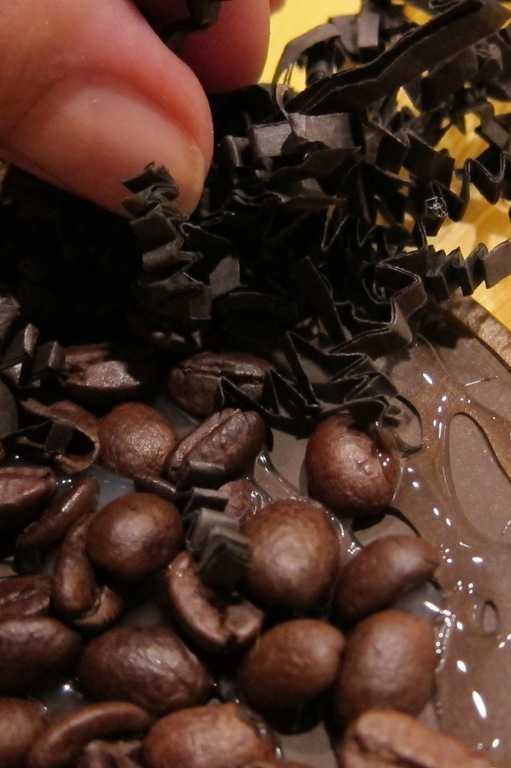Видите, в серединке приклеены кофейные зерна и вермишель из коричневой рифленой бумаги. Кукурузные початковые листья мастер окрасила желтой краской. Оригинальная работа:)