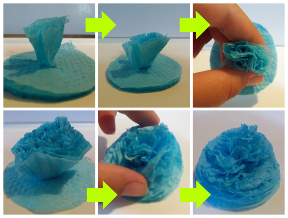 5 # Теперь начните осторожно растирать слои салфетки вверх, в направлении, противоположном проволоке. Каждый слой должен быть разделен на три очень тонких листа, так что всего у вас должно получиться шесть слоев «лепестков» с каждой стороны.Как только все слои разделятся, взбейте цветок, и все готово.