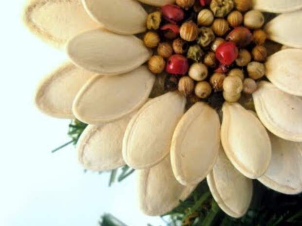 Очистите и просушите тыквенные семечки, затем используйте их, чтобы сделать ожерелья из бисера (вспомните традиционные ожерелья из ракушек пука на островах Тихого океана). Сделайте отверстия в центре семян и нанижите пучок на шнур, чтобы получились красивые украшения из тыквенных семечек.