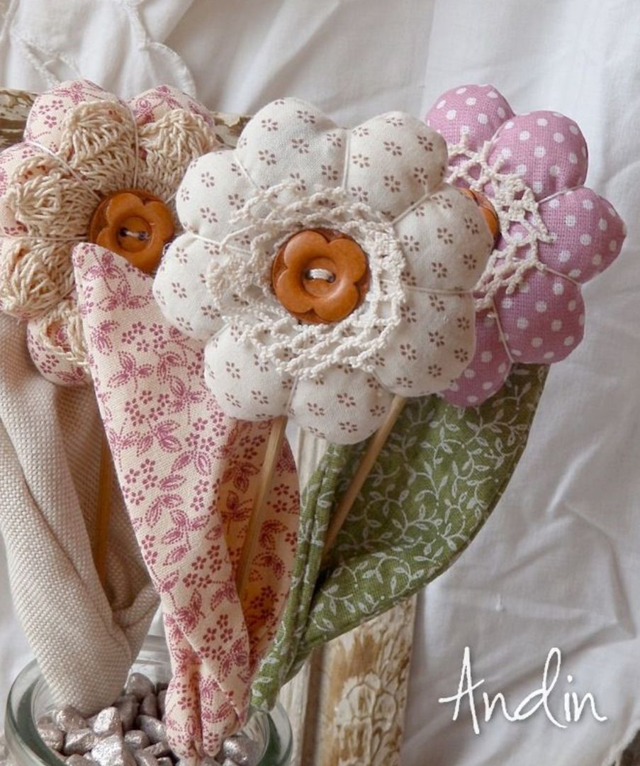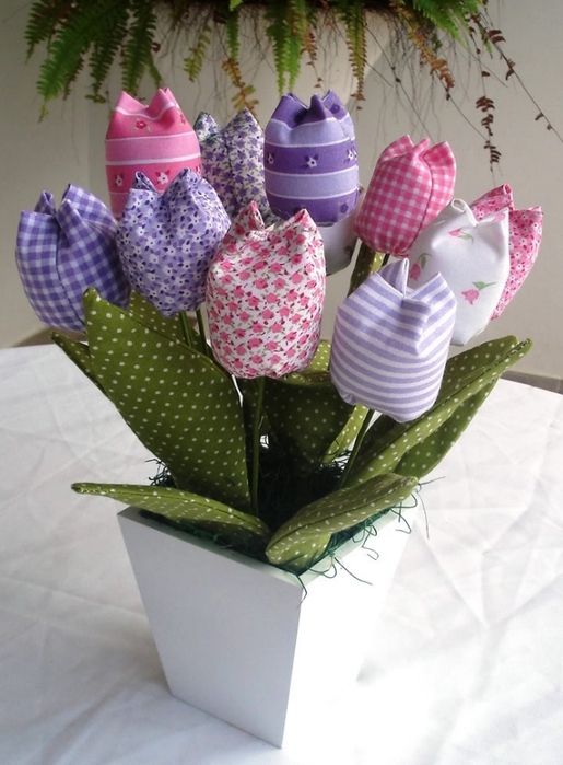Такие поделки из ткани своими руками можно сшить для мамы на День матери или 8 марта, для бабушки на День пожилого человека, или для лучшей подруги, дополнив основной подарок на День рождения. Текстильный букет не увянет, будет радовать своим цветом долго.