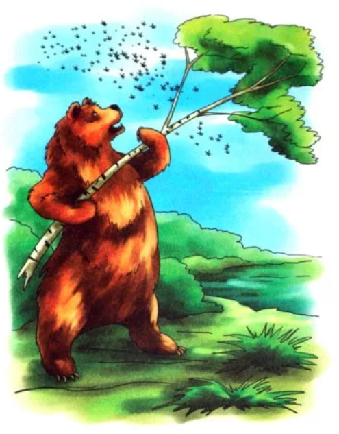 Засмеялись комары тонкими голосами и бросились на медведя уже всем войском. Пищат, кружатся, лезут… Отбивался отбивался Миша, проглотил нечаянно штук сто комариного войска, закашлялся, да как сорвется с сука, точно мешок… Однако поднялся, почесал ушибленный бок и говорит: