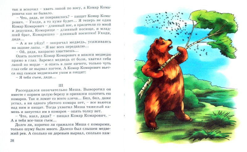– Что, дядя, не понравилось? – пищит Комар Комарович. – Уходи, а то хуже будет. Я теперь не один Комар Комарович – длинный нос, а прилетели со мной и дедушка, Комарище – длинный носище, и младший брат, Комаришко – длинный носишко! Уходи, дядя.