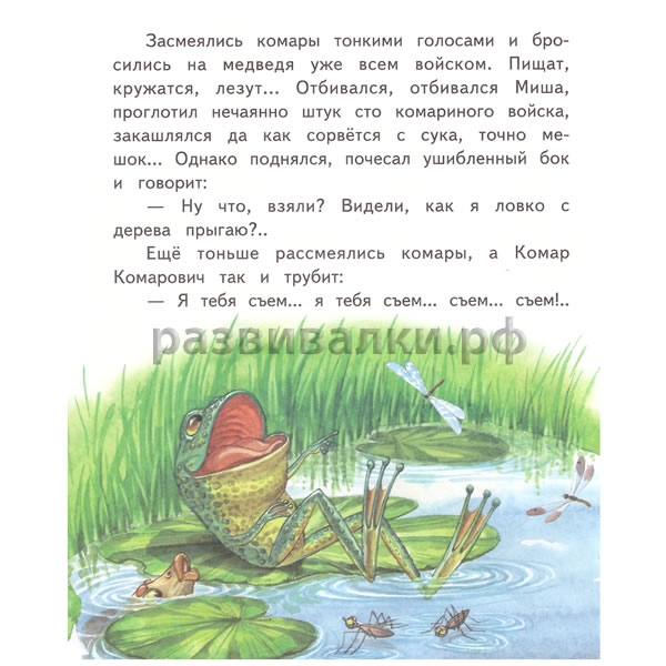 – Ой, батюшки! Пришёл в наше болото медведь и завалился спать. Как лёг в траву, так сейчас же задавил пятьсот комаров; как дохнул – проглотил целую сотню. Ой, беда, братцы! Мы едва унесли от него ноги, а то всех бы передавил.