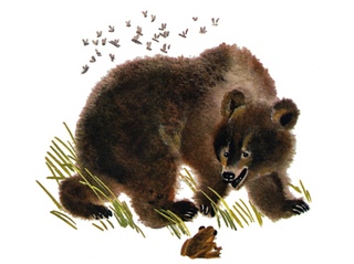 Изнемог окончательно медведь, выбился из сил, а уходить из болота стыдно. Сидит он на задних лапах и только глазами моргает.