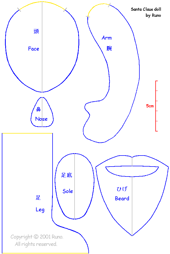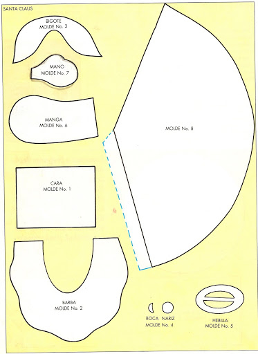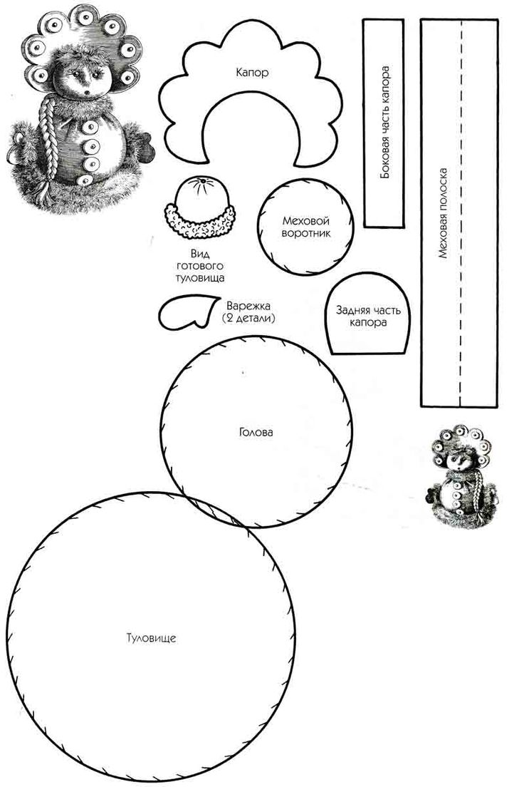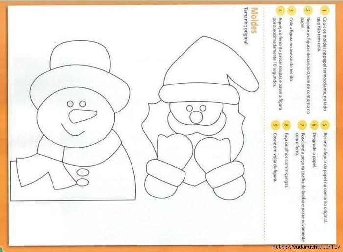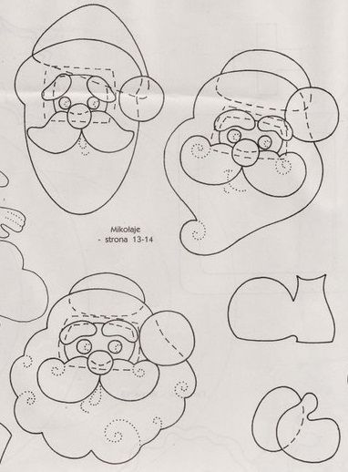 Шаблоны для такой твердой аппликации мы видим на схеме ниже. Все детали получаются твердыми прочными и мы можем их не наклеивать и не нашивать — а насадить на клепки, чтобы они свободно крутились. И у Деда Мороза будут сгибаться ручки и ножки.