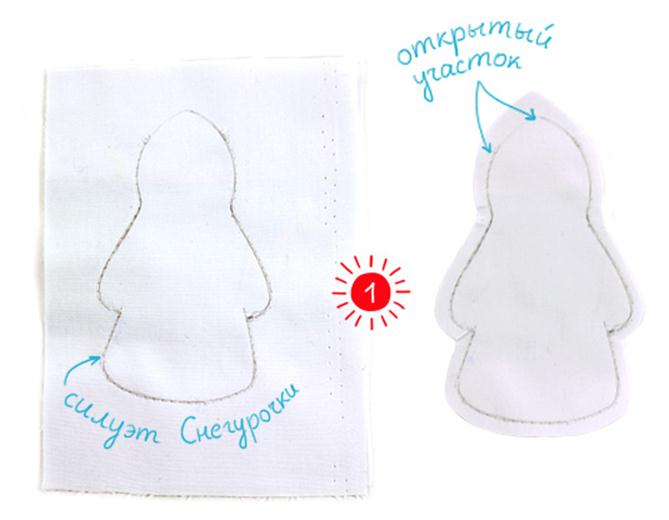 Делаем строчки в два слоя ткани на машинке по этим контурам. Оставляем открытыми срезы внизу туловища и вверху рук (через них будет осуществляться набивка).