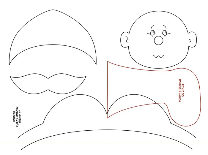 Перерисовав шаблон на лист бумаги, вырежьте все детали. Так как наш дедушка – не однотонный, необходимо приготовить фетр определенных цветов. Материал бежевого, светло-розового или светло-коричневого оттенков подойдет для создания лица. Борода, усы и ободок шапки должны быть белого цвета. Сам головной убор нужно сделать из фетра красного оттенка. Все вырезанные детали выкройки следует приложить на материал соответствующих цветов и, воспользовавшись маркером, аккуратно обвести шаблоны.