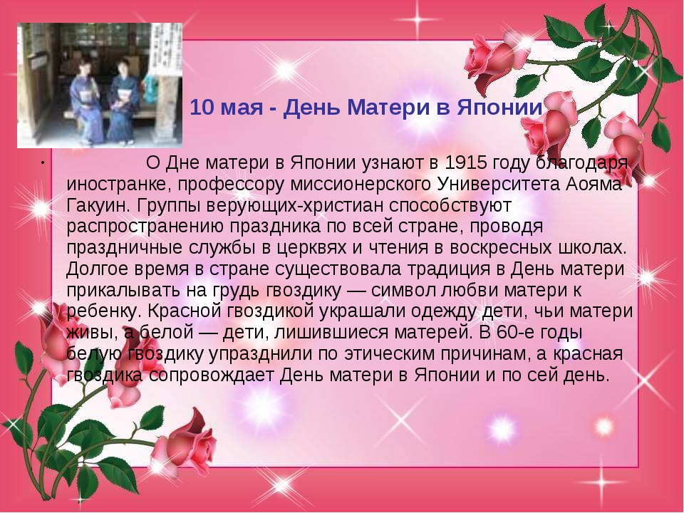 По некоторым источникам традиция празднования Дня матери берет начало еще в женских мистериях древнего Рима, предназначенных для почитания Великой Матери – богини, матери всех богов. Также известно, что в Англии XV века отмечалось так называемое “Материнское воскресенье” – четвертое воскресенье Великого поста, посвященное чествованию матерей по всей стране.
