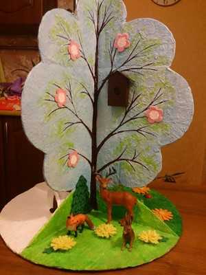 Для игр детей дома или в детском учебном заведении возможно сделать древо из картона, которое будет объёмным. Для изготовления поделки можно использовать сжатую бумагу, ткань, гофрированный материал или воздушные шары. Не очень сложно создать дерево из пенопласта. С помощью этого мастер-класса взрослый и даже ребёнок сможет вырезать и собрать дерево, которое украсит любую комнату и может располагаться в самом её центре.