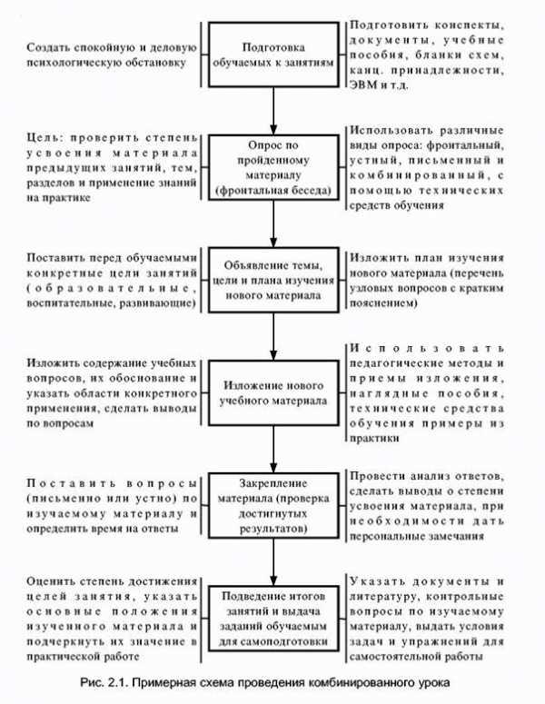 ΠΠΎΡΡΠ΄ΠΎΠΊ ΠΏΡΠΎΠ²Π΅Π΄Π΅Π½ΠΈΡ ΠΊΠΎΠΌΠ±ΠΈΠ½ΠΈΡΠΎΠ²Π°Π½Π½ΠΎΠ³ΠΎ Π·Π°Π½ΡΡΠΈΡ ΠΎΡΡΠ°ΠΆΠ΅Π½ Π½Π° ΡΠΈΡ. 2.1, Π³Π΄Π΅ ΡΠΊΠ°Π·Π°Π½Ρ Π²ΡΠ΅ ΠΎΡΠ½ΠΎΠ²Π½ΡΠ΅ Π΅Π³ΠΎ ΡΠ»Π΅ΠΌΠ΅Π½ΡΡ. ΠΠΎΠ΄Π³ΠΎΡΠΎΠ²ΠΊΠ° (ΠΎΡΠ³Π°Π½ΠΈΠ·Π°ΡΠΈΡ) ΠΎΠ±ΡΡΠ°Π΅ΠΌΡΡ ΡΠ²Π»ΡΠ΅ΡΡΡ, ΠΊΠ°ΠΊ ΠΏΡΠ°Π²ΠΈΠ»ΠΎ, ΡΠ»Π΅ΠΌΠ΅Π½ΡΠΎΠΌ, ΠΏΡΠΈΡΡΡΠΈΠΌ Π»ΡΠ±ΡΠΌ Π·Π°Π½ΡΡΠΈΡΠΌ. ΠΠ΅ ΡΡΡΡ Π·Π°ΠΊΠ»ΡΡΠ°Π΅ΡΡΡ Π² ΡΠΎΠΌ, ΡΡΠΎΠ±Ρ ΠΏΡΠΈΡ ΠΎΠ»ΠΎΠ³ΠΈΡΠ΅ΡΠΊΠΈ Π½Π°ΡΡΡΠΎΠΈΡΡ Π½Π°ΡΡΠΎΡΡΠ°Π² Π½Π° ΠΏΠ»ΠΎΠ΄ΠΎΡΠ²ΠΎΡΠ½ΡΡ ΡΠ°Π±ΠΎΡΡ, Π΄ΠΎΠ±ΠΈΡΡΡΡ Π²Π½ΠΈΠΌΠ°Π½ΠΈΡ ΠΈ Π°ΠΊΡΠΈΠ²Π½ΠΎΠ³ΠΎ ΠΎΡΠ½ΠΎΡΠ΅Π½ΠΈΡ ΠΊ Π·Π°Π½ΡΡΠΈΡΠΌ. ΠΠ»Ρ ΡΡΠΎΠΉ ΡΠ΅Π»ΠΈ ΡΡΠΊΠΎΠ²ΠΎΠ΄ΠΈΡΠ΅Π»Ρ Π·Π°Π½ΡΡΠΈΠΉ ΠΌΠΎΠΆΠ΅Ρ ΠΈΡΠΏΠΎΠ»ΡΠ·ΠΎΠ²Π°ΡΡ ΡΠ»Π΅ΒΠ΄ΡΡΡΠΈΠ΅ ΠΏΡΠΈΠ΅ΠΌΡ: Π²ΠΎΠΉΠ΄Ρ Π² Π°ΡΠ΄ΠΈΡΠΎΡΠΈΡ, ΡΠ΄Π΅Π»Π°ΡΡ Π½Π΅Π±ΠΎΠ»ΡΡΡΡ ΠΏΠ°ΡΠ·Ρ, ΠΎΠ·Π½Π°ΡΠ°ΡΒΡΡΡ, ΡΡΠΎ Π½Π°ΡΡΠΎΡΡΠ°Π²Ρ ΡΠ»Π΅Π΄ΡΠ΅Ρ ΡΡΠΏΠΎΠΊΠΎΠΈΡΡΡΡ; ΡΠ΄Π΅Π»Π°ΡΡ, ΡΠ°ΠΊΡΠΈΡΠ½ΠΎΠ΅ Π·Π°ΠΌΠ΅ΡΠ°Π½ΠΈΠ΅ ΠΎΡΠ΄Π΅Π»ΡΠ½ΡΠΌ Π»ΠΈΡΠ°ΠΌ Π·Π° Π½Π°ΡΡΡΠ΅Π½ΠΈΠ΅ ΡΠΈΡΠΈΠ½Ρ; ΠΏΠΎΠΏΡΠΎΡΠΈΡΡ ΠΏΠΎΠ΄Π³ΠΎΡΠΎΠ²ΠΈΡΡ ΡΠ΅ΡΡΠ°Π΄ΠΈ, ΡΡΠ΅Π±Π½ΡΠ΅ ΠΏΠΎΡΠΎΠ±ΠΈΡ, Π½Π°ΠΏΠΎΠΌΠ½ΠΈΡΡ ΠΏΡΠΈΠΌΠ΅ΡΠ°ΡΠ΅Π»ΡΠ½ΠΎΠ΅ ΡΠΎΠ±ΡΡΠΈΠ΅ ΠΈΠ»ΠΈ ΡΠ°ΠΊΡ, ΠΏΡΠΎΠΈΡΒΡΠ΅Π΄ΡΠΈΠΉ Π² ΡΠ°ΡΡΠΈ, ΡΡΠΎΠ±Ρ ΠΎΡΠ²Π»Π΅ΡΡ ΠΎΠ±ΡΡΠ°Π΅ΠΌΡΡ ΠΎΡ Π΄ΡΡΠ³ΠΈΡ Π²ΠΏΠ΅ΡΠ°ΡΠ»Π΅Π½ΠΈΠΉ ΠΈ Π½Π°ΡΡΒΡΠΎΠΈΡΡ Π½Π° ΡΠ°Π±ΠΎΡΡ. Π ΡΠΊΠΎΠ²ΠΎΠ΄ΠΈΡΠ΅Π»Ρ Π·Π°Π½ΡΡΠΈΡ Π²ΡΠ΅Π³Π΄Π° Π΄ΠΎΠ»ΠΆΠ΅Π½ Π±ΡΡΡ ΡΠΏΠΎΠΊΠΎΠ΅Π½, ΡΠΎΠ±ΡΠ°Π½, Π΄ΠΎΠ±ΡΠΎΠΆΠ΅Π»Π°ΡΠ΅Π»Π΅Π½; ΠΎΠ½ Π½Π΅ Π΄ΠΎΠ»ΠΆΠ΅Π½ Π΄Π΅Π»Π°ΡΡ Π½Π΅ΡΠ°ΠΊΡΠΈΡΠ½ΡΠ΅ Π·Π°ΠΌΠ΅ΡΠ°Π½ΠΈΡ, ΠΏΠΎΠ²ΡΡΠ°ΡΡ Π³ΠΎΠ»ΠΎΡ. ΠΡΠ³Π°Π½ΠΈΠ·Π°ΡΠΈΡ ΠΎΠ±ΡΡΠ°Π΅ΠΌΡΡ Π΄Π»Ρ ΠΏΡΠΎΠ²Π΅Π΄Π΅Π½ΠΈΡ Π·Π°Π½ΡΡΠΈΠΉ Π½Π΅ Π·Π°Π½ΠΈΠΌΠ°Π΅Ρ ΠΌΠ½ΠΎΠ³ΠΎ Π²ΡΠ΅ΠΌΠ΅Π½ΠΈ, Π½ΠΎ Π²ΠΌΠ΅ΡΡΠ΅ Ρ ΡΠ΅ΠΌ Π΄Π°Π΅Ρ ΠΈΠΌ ΠΎΠΏΡΠ΅Π΄Π΅Π»Π΅Π½Π½ΡΠΉ Π·Π°ΡΡΠ΄ ΠΏΡΠΈΡ ΠΎΠ»ΠΎΠ³ΠΈΡΠ΅ΡΠΊΠΎΠΉ ΡΠ½Π΅ΡΠ³ΠΈΠΈ ΠΈ ΠΏΠΎΠ²ΡΡΠ°Π΅Ρ ΡΠ°Π±ΠΎΡΠΎΡΠΏΠΎΡΠΎΠ±Π½ΠΎΡΡΡ.