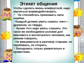 • Если к тебе кто-то обращается, а ты в это время чем-то занят, отложи на время свои дела и посмотри на собеседника, покажи ему свою готовность участия в разговоре.