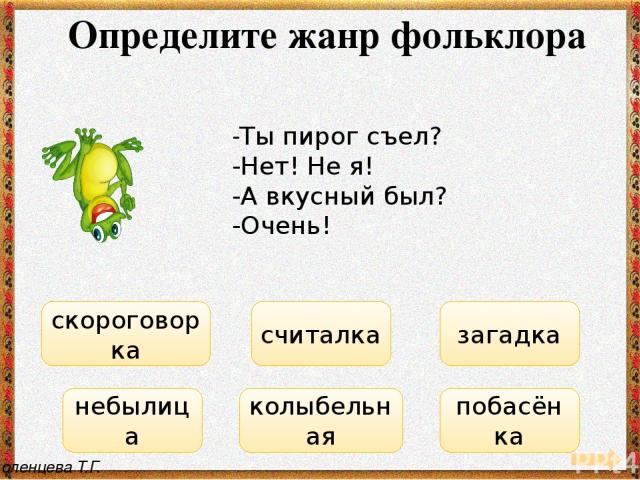 — Где ты, брат Иван? — В горнице. — А что делаешь? — Помогаю Петру. — А Петр что делает? — Да на печи лежит. | — Ножки, ножки, где вы были? — За грибами в лес ходили. — Что вы, ручки, работали? — Мы грибочки собирали. — А вы, глазки, помогали? — — Мы искали и смотрели – Все пенечки оглядели. |