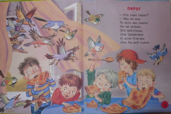 — Ты пирог съел? — Нет, не я! — А вкусный был? — Очень. | — Воробей, чего ты ждешь? Крошек хлебных не клюешь? — Я давно заметил крошки, Да боюсь сердитой кошки. |
