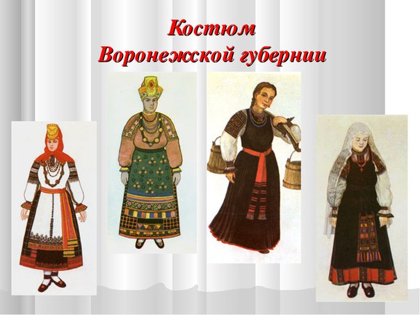 | Введение Нам, россиянам, русского костюма Историю полезно очень знать! Костюм о людях призовет подумать, О быте, нравах может рассказать. В себе не станем мы растить невежу, По выставке пройдемся не спеша, Рассмотрим древнерусскую одежду: Не правда ли проста и хороша! Да, буквально замираешь перед великолепием народного костюма, который сохранило нам время. Кажется, все краски лесов, степей, неба слились в этом поистине чудном творении рук человеческих. Интересовались ли вы когда-нибудь тем, как выглядели наши предки сто лет назад? Крестьяне с древних времен хранили и передавали традиции новым поколениям в устройстве дома, обычаях, праздниках, верованиях и, конечно, в одежде. Национальная одежда – это своеобразная книга, научившись читать которую, можно много узнать об истории и традициях, своего народа. Жизнь крестьянина была неразрывно связана с природой, возделыванием земли. А праздники либо завершали какие-либо этапы крестьянской трудовой жизни, либо предшествовали им. Праздники ждали, к ним готовились. А какие наряды надевали в праздники? Вся эта одежда и у мужчин, и у женщин была очень красивой. В ней обязательно присутствовали элементы декора: вышивка, бисер, шитье, шнур, блестки. Желание сделать одежду красивой требовало огромного труда, терпения, фантазии. Именно здесь проявлялись вкус, дарование и мастерство женщин – крестьянок, ведь все делалось руками своими руками. Такая одежда могла многое рассказать о своем владельце: откуда он родом, какого возраста, по какому случаю так одет. Одежда каждой области (губернии) России имела свои орнаменты, излюбленные цвета, отделку, формы и фасоны. Отличительные черты костюма в Воронежской губернии Комплекс одежды девушки – сарафанный. По яркости, цвету, и богатству украшений он был несколько беднее женского, но не менее красив. Для южнорусских областей характерна многослойность одежды, которая скрывала фигуру женщины, костюм отличался цельным объемом, лаконичностью, мягким плавным контуром. Русская женщина во время движения напоминала то лебедушку, то паву. Недаром в русском фольклоре ее приравнивают к жар-птице, величают голубкой, лебедушкой, павушкой, ласточкой. Роль головных уборов и украшений в повседневном и праздничном костюме Женский костюм немыслим без головного убора. Молодым девушкам разрешалось показывать свои волосы. «Девичья коса – всему миру краса» – они носили легкие и воздушные накосники, коруны, венцы, кокошники, ленты, обручи. Коса свободно ниспадала из-под головного убора. По праздникам девушки украшали свою косу, вплетая в нее нити жемчуга, длинные яркие ленты. Маленькие девочки носили на лбу неширокие матерчатые ленты. Одним из красивейших и оригинальных женских головных уборов в нашем крае был кокошник, получивший большое распространение. Любимым убором для женщин и девушек был платок. Он был красив и удобен в использовании. Его можно было носить как самостоятельно, так и в сочетании с другими головными уборами или на плечах. Платок был самым желанным подарком для женщин и девушек. Да ребята действительно старинные русские тканые шали и набивные платки и сегодня восхищают своей красотой, бесчисленностью сказочных узоров, праздничными цветовыми сочетаниями. Праздничая женская обувь состояла из черевиков, украшенных пучками, бисером и медной подко
