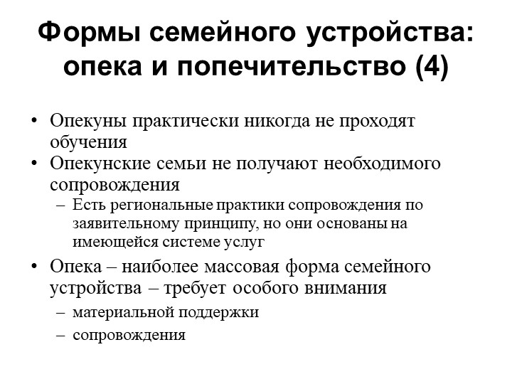 Семейные формы устройства детей наиболее приоритетны, т.к. они дают ребенку возможность получить положительный опыт семейной жизни, пройти внутрисемейный процесс социализации.