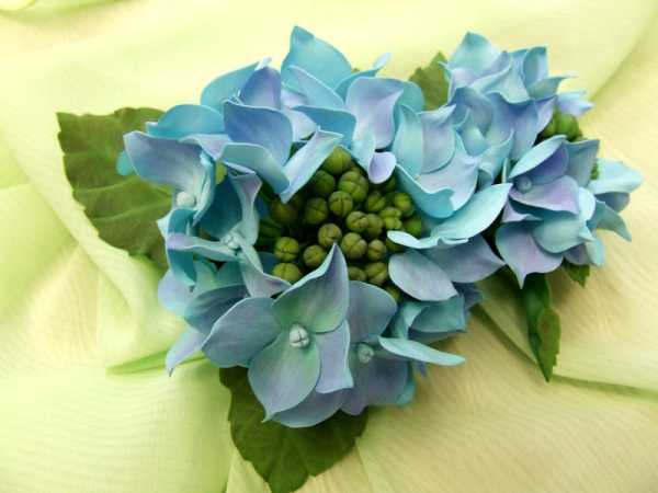 Соцветие гортензии, декорированное листикамиМожно изготовить большие цветы из фоамирана, они станут настоящим украшением интерьера, и в этом нам поможет следующий мастер-класс. Нужно подобрать схему, обвести по шаблону лепестки и вырезать их. Для придания формы разогреть заготовки на утюге, затем руками сформировать выпуклости, а также немного загнуть края. Можно пастелью выполнить плавные оттеночные переходы и зубочисткой нарисовать прожилки.